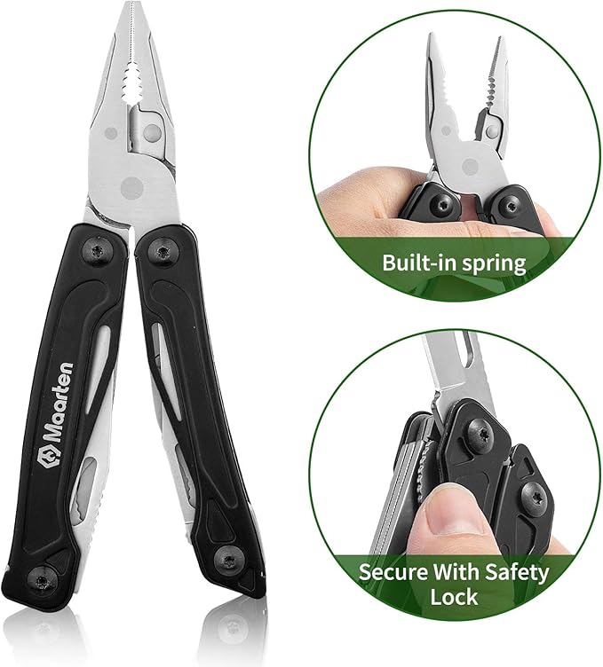 - Special Safety Lock Device: The multitool pliers with safety lock. All-locking features means that every multi tool and knife will lock when fully opened, keeping you safe and the tools securely in place.Multi-function pliers with springs.You can master the Multi-Purpose tool and handle any problems easily!