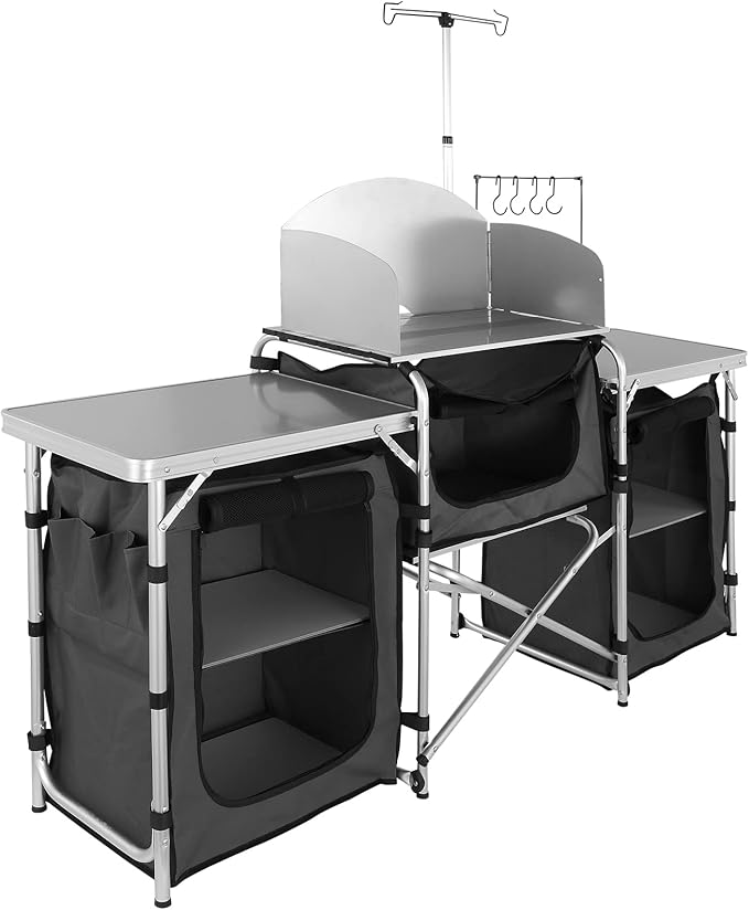 - 【Ready for Any Adventure】- Whether you're RV traveling, camping, picnicking, hosting a backyard BBQ, or just enjoying a night under the stars, our camping table is the ideal solution for all your outdoor needs. The outdoor camping kitchen provides a sturdy surface for placing and storing items while enhancing your overall outdoor experience.