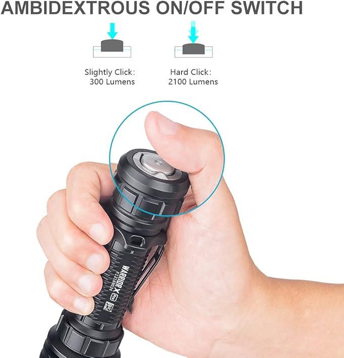 - [Ease of Use and Convenience] Choose high/low mode by pressing the strong magnetic tail switch. The aggressive texture protects flashlight from slipping down, and the clip can make the light attach to strap