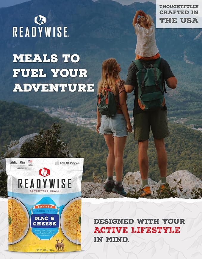 READYWISE - Adventure Meal, Mac & Cheese, 2 Servings, Pack of 1, Emergency Preparedness, Freeze Dried Food, MRE, Snack Pack or Emergency Food, Backpacking, Camping, Hiking, and, Survival Food