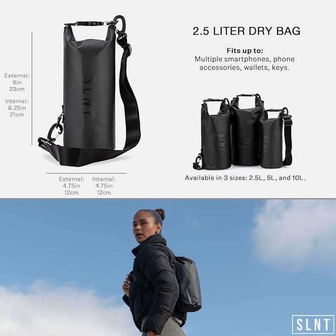 - Great for Travel, Outdoors, & Long-term Storage: The 2.5 Liter bag has internal use dimensions of 8.25 x 4.75 x 4.75 inches. Fits all modern smartphones, wallets, keys, earbuds, and accessories. Has a quick and easy roll down and clip closure. A great dry bag for outdoor lifestyles and travel, perfect for kayaking, boating, camping, beach trips, swimming, or the gym. Keep your devices away from wet clothes and away from hackers!
