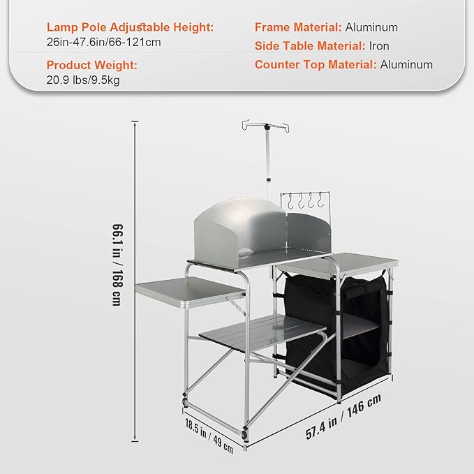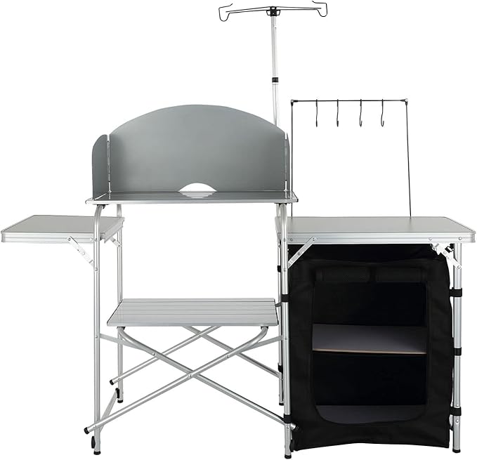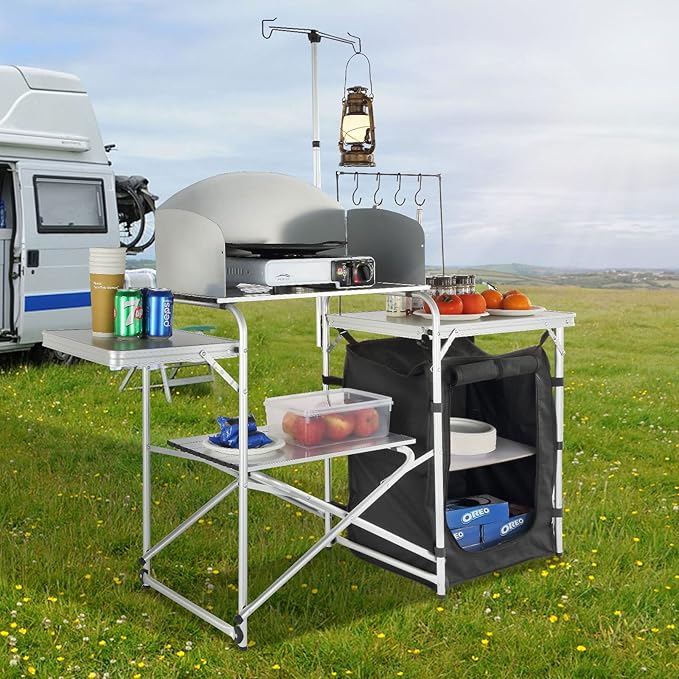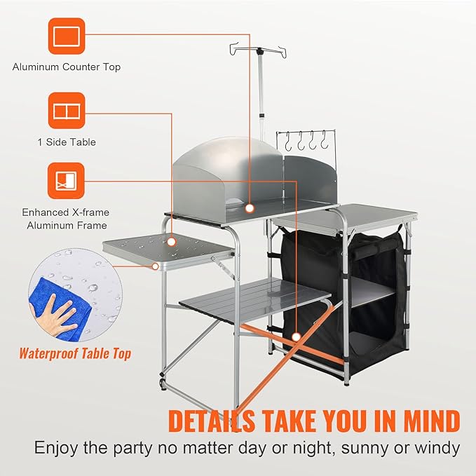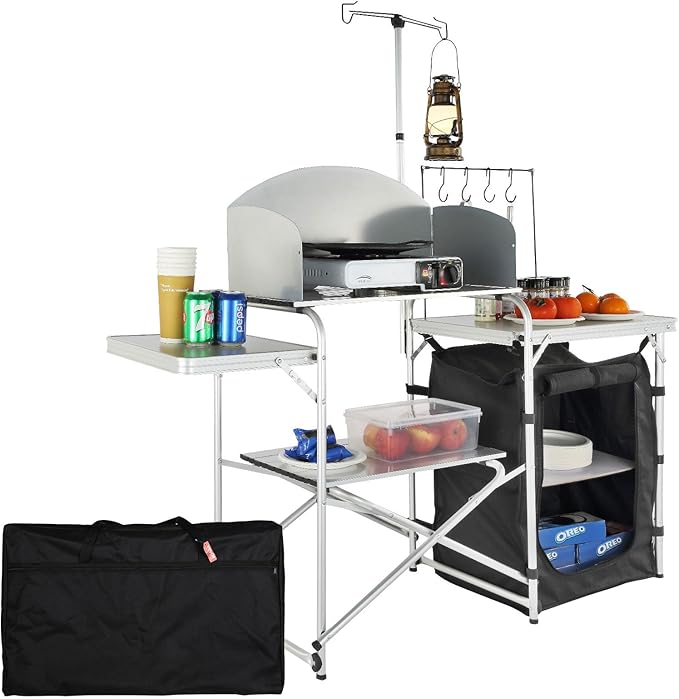 - Spacious Storage Space: The camp kitchen table comes with a roll-up aluminum tabletop, a windshield and 2 side tables, holding your grills, cooking tools, condiments, and other supplies. The 2-tier detachable storage organizer provides you with extensive space to place utensils in order.