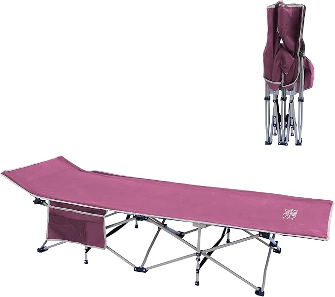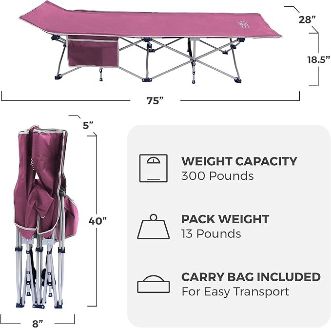 - ULTRA COMFORTABLE - The open sleeping cot dimensions are 28 inches wide, 75 inches long, and 18.5 inches high so you can sleep comfortably on your side or back; an elevated headrest ensures comfort with or without a pillow.
