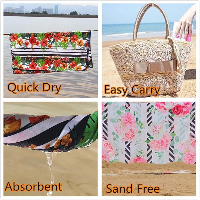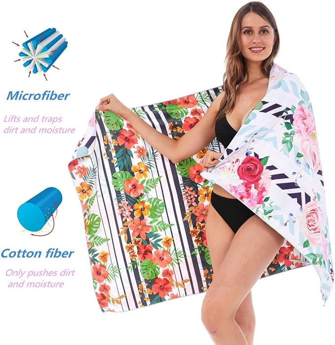 - ❤[SIZE AND MATERIAL]: Beach towel size is 31" x 63". New developed microfiber material is eco-friendly, no faded and no smell which is not same as normal towel material. It has special characteristics – quick dry, super absorbent, sand free, baby soft;