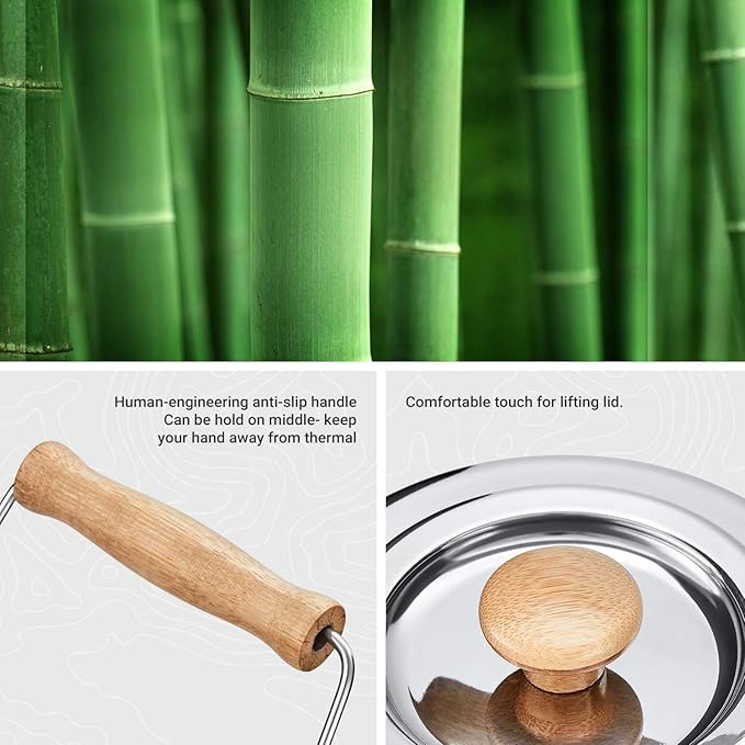 - [EAST TO USE]- The bamboo handle and lid made by human-engineering design keeps your finger away from the heat, will not be burned when pouring hot water. Handle can be locked on the middle to let you lift the hot water kettle safe. Equipped with a portable stainless steel tea drain, which is convenient to help you boil tea, coffee. Going to outdoor does not necessarily mean going to be rough!