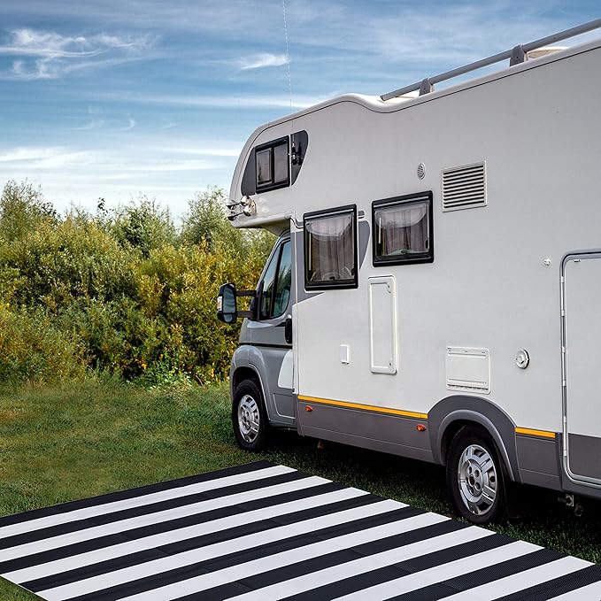 FH Home Outdoor Camping Rug - Waterproof, Fade Resistant, Reversible - Premium Recycled Plastic - Striped - Large Patio, Deck, Sunroom, RV - Brittany Stripe - Black & White - 9 x 12 ft Foldable