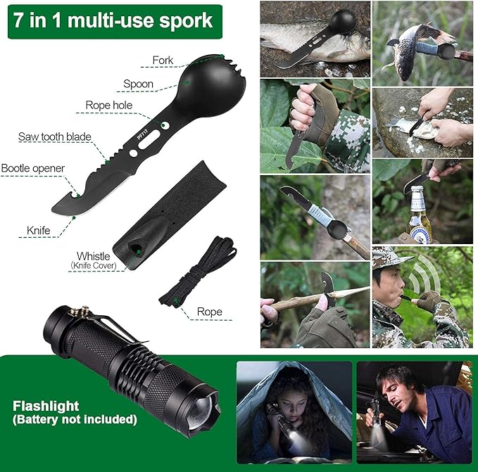 - 【Life Saving Tools】- Nice variety of cool tools and gadgets has the essentials you need to feel secure when adventuring outdoors. Getting lost, needing a fire, cold or rainy conditions are no longer a problem when you have our life saving tools. Be prepared, be safe, This survival gear military tactical kit is all you need when the unexpected happens