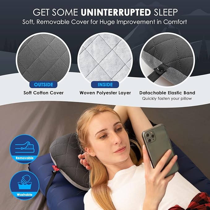 Hikenture Camping Pillow with Removable Cover - Ultralight Inflatable Pillow for Neck Lumbar Support - Upgrade Backpacking Pillow - Washable Travel Air Pillows for Camping, Hiking, Backpacking