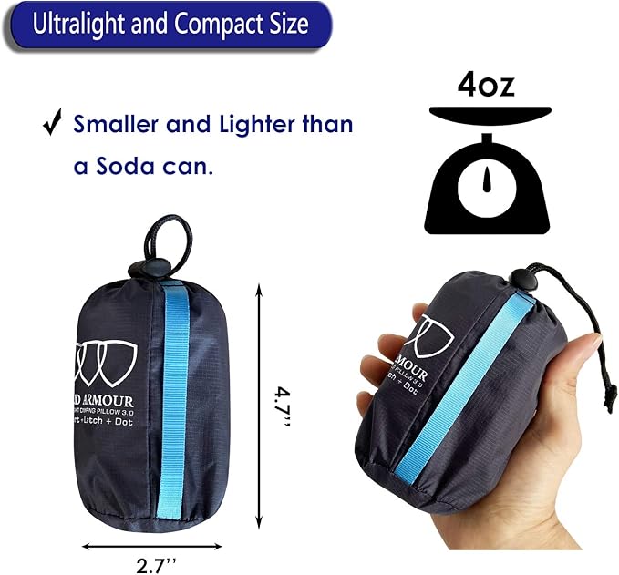 - WEIGHS ONLY [4 OZ] AND PACKS DOWN TO SMALLER THAN A SODA CAN - PERFECT FOR A BACKPACKING Pillow! No worrying about the room in your backpack with this very convenient ultralight inflatable travel pillow. Inflated size for this camping travel pillow is 17.3in (L) x 11in (W) x 4in (H)