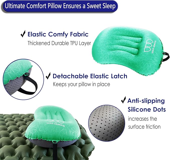 - STAYS IN PLACE THROUGHOUT THE NIGHT – Our travel pillow is durable, rugged material features anti-slip rubber dots to enhance friction against any sleep surface. This set also includes removable latch strap for attaching to inflatable pad