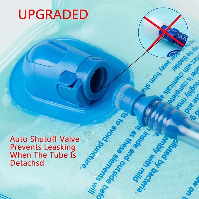 - UPGARDE LEAK PROOF:Soft yet durable mouthpiece with easily accessible ON/OFF valve non-leaking. You can control the water flow by biting, First pull up on the drinking cap, gently bite the mouthpiece with your front teeth to have a sip and start drinking, push back to stop water flow. Quick-release tube is detachable. Auto shut off while the tube is removed, the hydration bladder will stay filled non-leaking. The water storage reservoir also has a dust cover to keep dirt out.