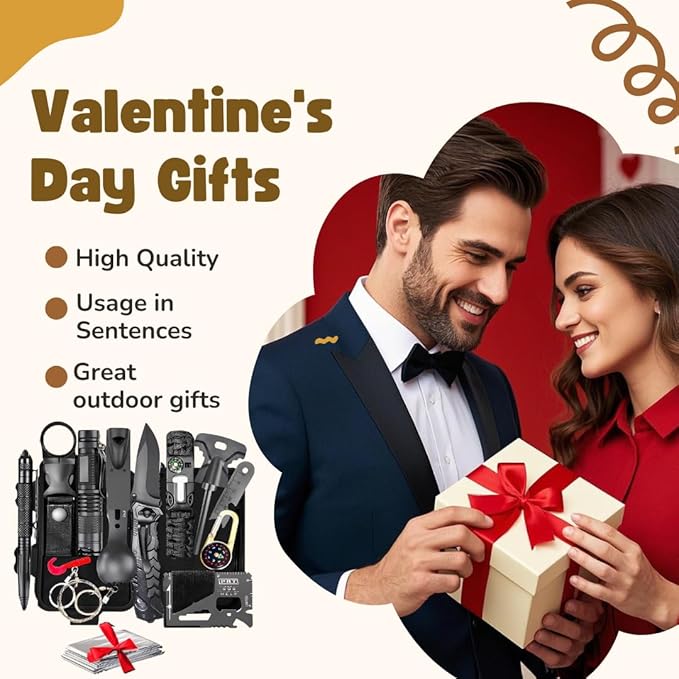 - 👍 Versatile 14 - in - 1 Survival Kit for Valentine's Day: Combines survivor essential tools. Suits Gifts for men of all ages (young adventurers to dads). Ensures preparedness for romantic camping, challenging hikes, or emergencies with survival gear and supplies military grade for durability & reliability, a must have outdoor lovers tools for men who have everything seeking a unique Valentine's gift.