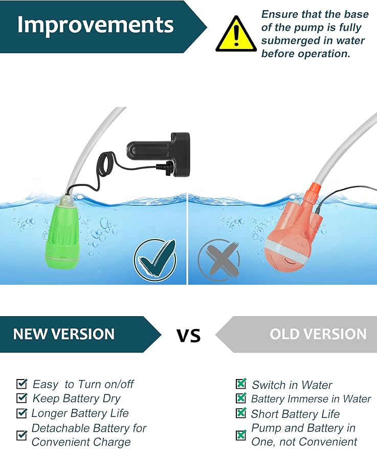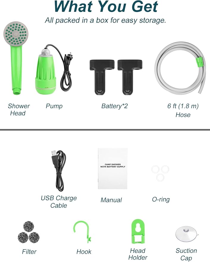 - 【Easy Assembly/Operation】Attach pump and shower head to the hose. Fully immerse the pump in water and press the switch on battery to start. The camping shower offers gentle and comfortable stream at 0.9 gal/min (3.5 L/min).