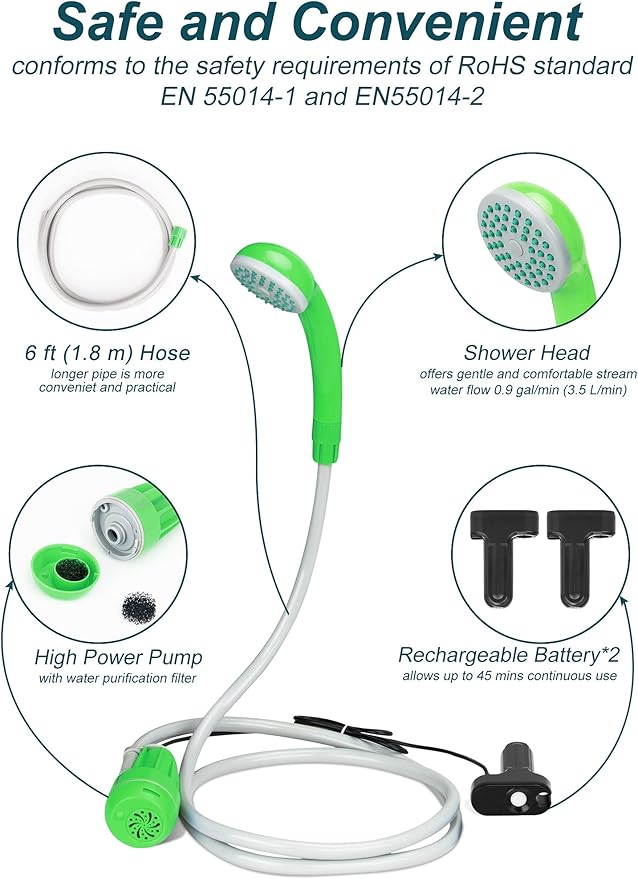 - 【Safe and Convenient Outdoor Camp Shower】innhom camp shower conforms to the safety requirements of RoHS standard, EN 55014-1 and EN55014-2. The water filter system ensure the water is clean and protect the shower head from being clogged. The O-ring protects water from escaping from the connection of the shower hose and showerhead.