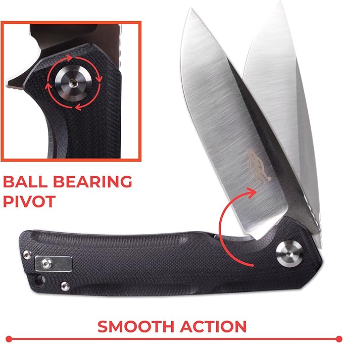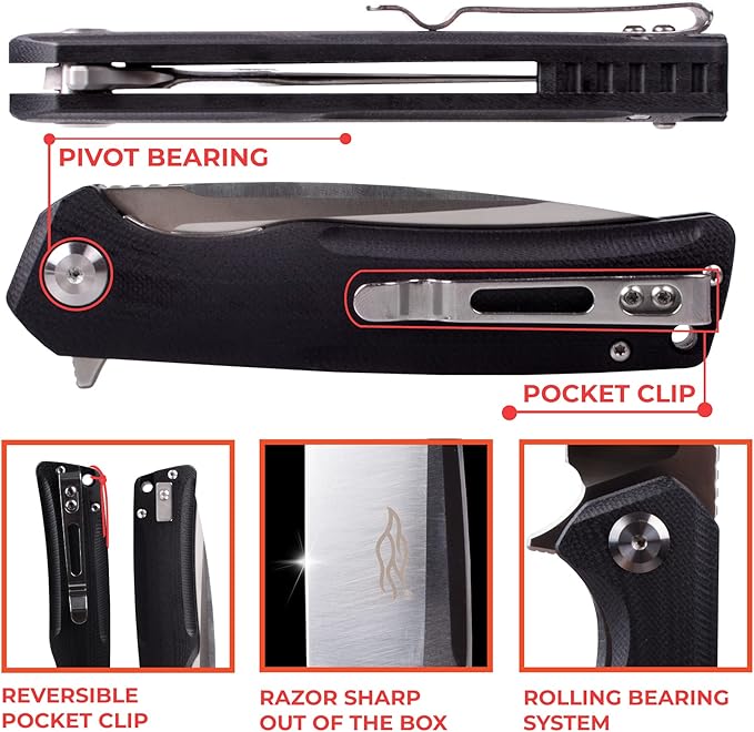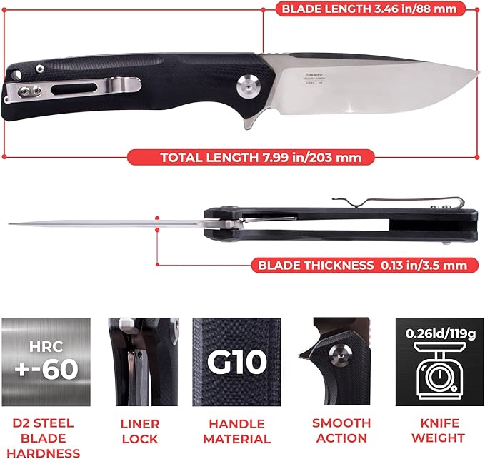 - ✅【Razor Sharp from the Box】The folding knife with clip has a perfectly plain and smoothly sharpened cutting edge. D2 steel keeps the sharpening well and for a long time. You don't need to sharpen your knife often.
