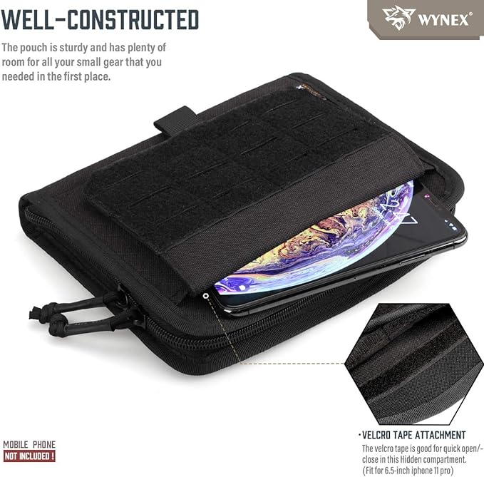 - FRONT HIDDEN POCKET: Molle Admin Pouch has a front compartment with Hook-N-Loop closure, front exterior has a large compartments with a magic sticker flap closure to ensure your items well organized and strong loading capacity