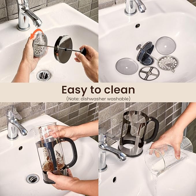 - Easy to Clean: Designed for convenience, the glass carafe easily disassembles for thorough cleaning; certain parts, including the plunger and filter, are dishwasher-safe—making cleanup effortless