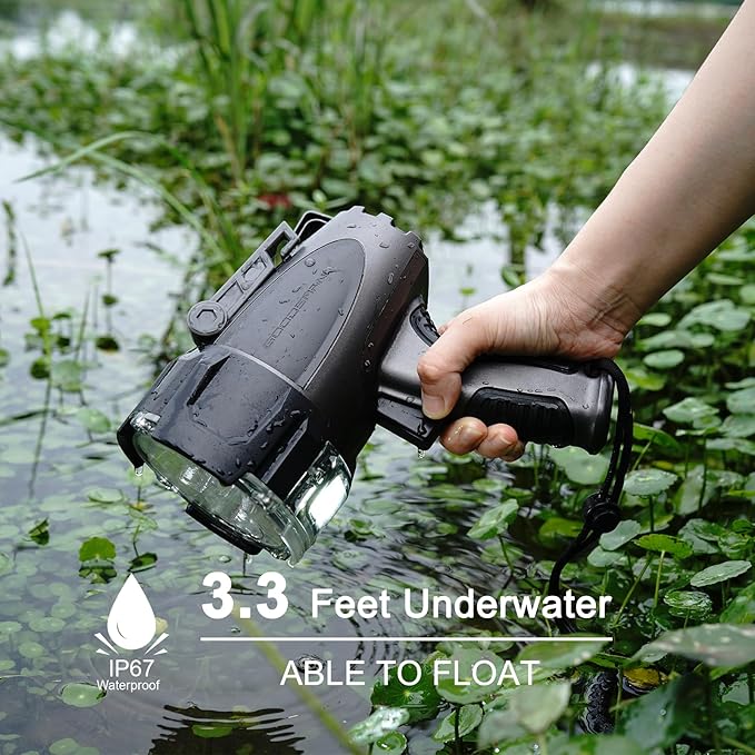 - WATERPROOF HANDHELD SPOTLIGHT: It's waterproof and is able to float underwater of the 3.3 feet depth, so you don't have to worry about it in the rain and water. Small and easy to store, is an ideal choice for hunting, searching, night fishing, hiking, camping and fishing marine