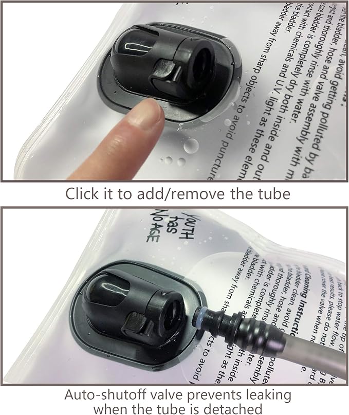 - 100% LEAK PROOF – Soft mouthpiece with easily accessible ON/OFF valve prevents leakage. Conveniently control the water flow by biting, when not bite, the water will not leak out. Quick-release tube is detachable. Auto shut off while the tube is removed, the hydration bladder will stay filled non-leaking, store neatly in fridge/icebox without tangling hose