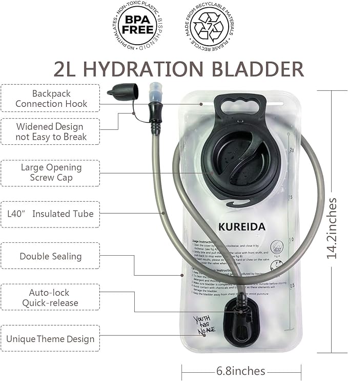 - THEME-DESIGN WATER BLADDERS FOR BACKPACKS – KUREIDA “ youth has no age” theme-design 2L water reservoir is the most unique design among the products in water bladder market. It is the best gift for yourself and friends who love outdoor sports. This 2L water reservoir can withstand temperatures from -20 to 50 degrees Celsius. L 14.2'' x W 6.8'' hydration bladder is compatible with most hydration backpacks. The tube (0.4”diameter, 40” long) provides a wholesome flow for easy drinking