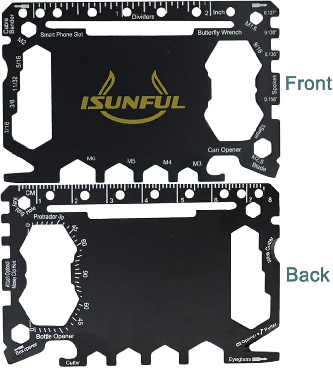 - 11 TOOLS: A Can Opener, Cutting Edge, Flat Screwdriver, Ruler, Beer Bottle Opener, 4 Position Wrench, Butterfly Screw Wrench, Saw Blade, Direction Ancillary Indication (Water Compass), 2 Position Wrench, Keychain or lanyard Hole. Includes a protective case so you can put it in your wallet or purse and comes with a tool identification card