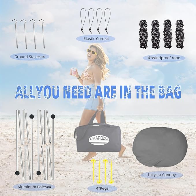 - PORTABLE WITH CONVENIENT TRAVEL BAG:Take UMARDOO sun shade beach tent with you wherever you go with our convenient travel bag. Our all-purpose pop-up sun tent comes packed with everything you need, including folding aluminum poles, tent pegs, and elastic cords.