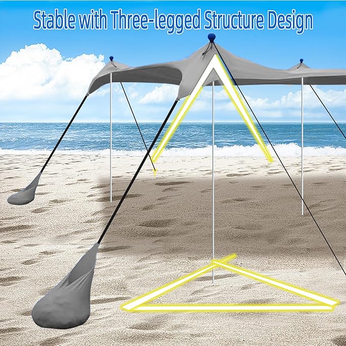 - STABILITY FEATURE:The beach shade canopy is supported by four aluminum poles (diameter 0.75 inch) and four large sandbags, along with 4 windproof ropes. They form a stable triangle that makes the tent highly wind-resistant.