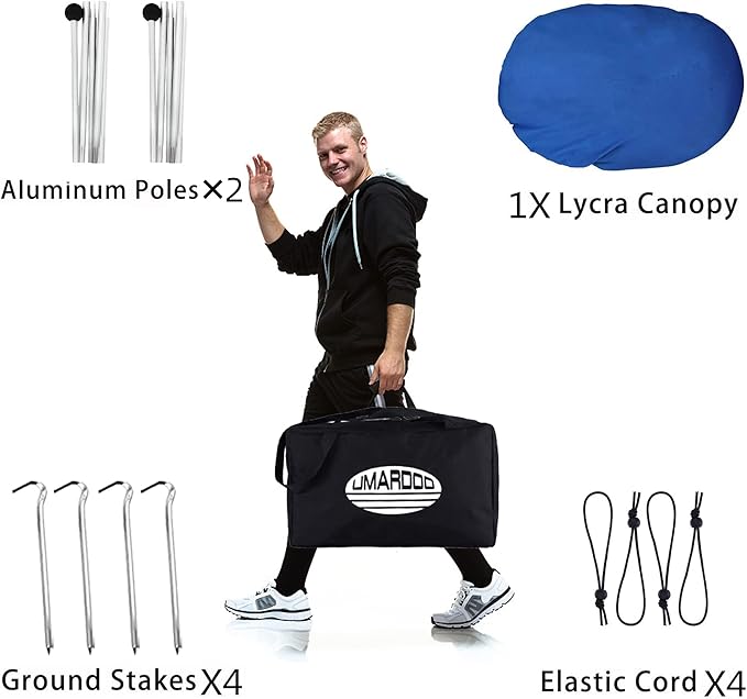 - Sun Protection UPF50+: The strong and elastic Lycra fabric has UPF 50+ protection and water-resistant function. Rust-proof aluminum poles are attached with a elastic cord preventing moving. Enjoy longer hours under the sun without worrying about sunburns.