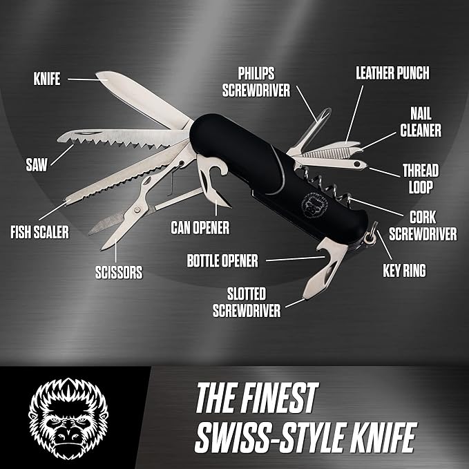 - PREMIUM GIFTABLE SMALL MULTITOOL SET - Give a gift he can use day after day, year after year with this premium Swiss-style multitool knife. Unlike most competing multi tool knives, ours comes complete with a GIFT BOX and SOFT LEATHER SHEATH, giving you a high-quality knife multitool gift set with a key ring you can use for easy carrying.