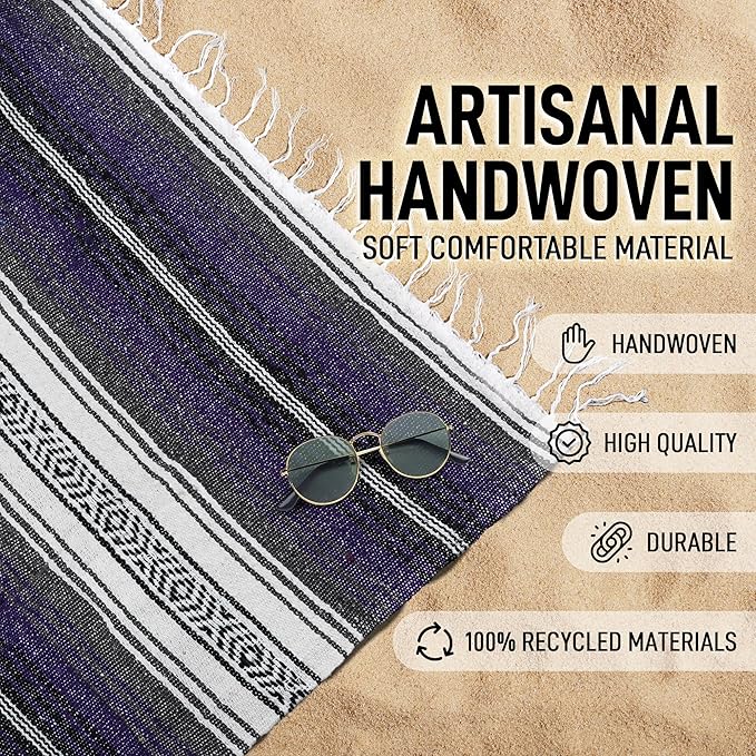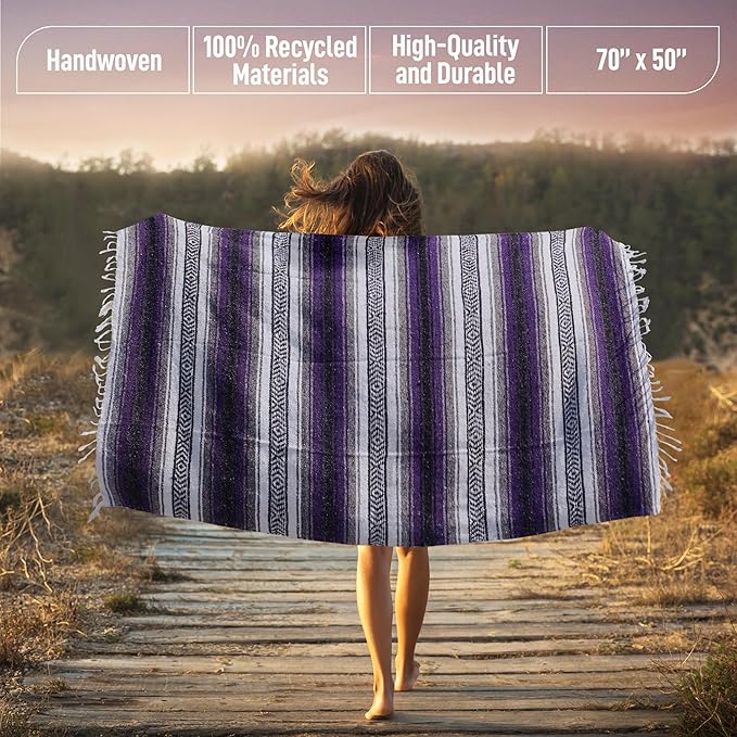 Authentic Extra Large Mexican Blanket (70"x50") - Handwoven Yoga Blanket, Serape Blanket - Artisanal Falsa Blanket, Beach Blanket, Camping Blanket, Picnic Blanket, Outdoor Blanket (Purple)