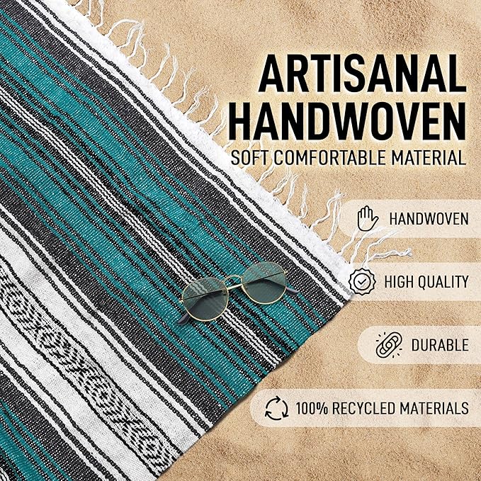 Authentic Extra Large Mexican Blanket (70"x50") - Handwoven Yoga Blanket, Serape Blanket - Artisanal Falsa Blanket, Beach Blanket, Camping Blanket, Picnic Blanket, Outdoor Blanket (Emerald)