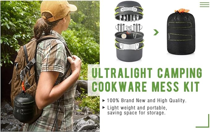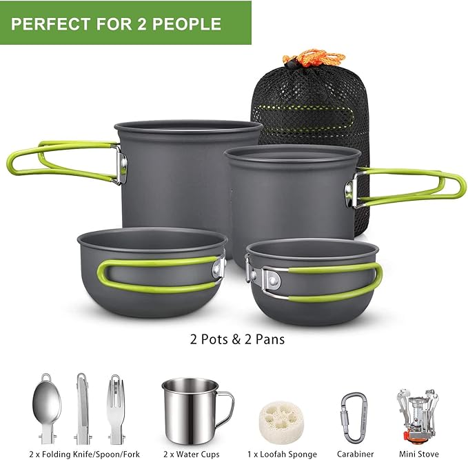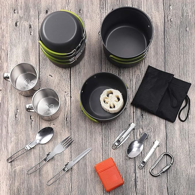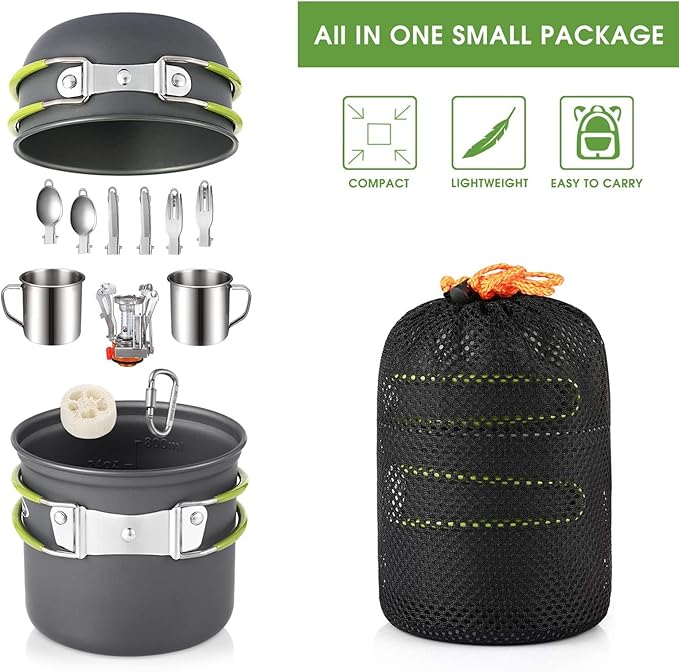 - PERFECT COOKWRAE: This cooking set is perfect for camping, backpacking, hiking, fishing, picnic, trekking, emergency preparedness, or as part of a survival kit. Highly recommend for a day trip or weekend trip. You can use it cooking, boil water, fry eggs, etc