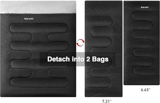 - FREE COMBINATION& DETACH - Roomy, rectangular shape provides maximum comfort and easily fits 2 people, so lofty and wide even for two big and tall persons to have plenty of room to stretch out. Double sleeping bags can be unzipped and separately zip into two individual sleeping bag. Sleeping bag of all size can unzip into a blanket for car camping