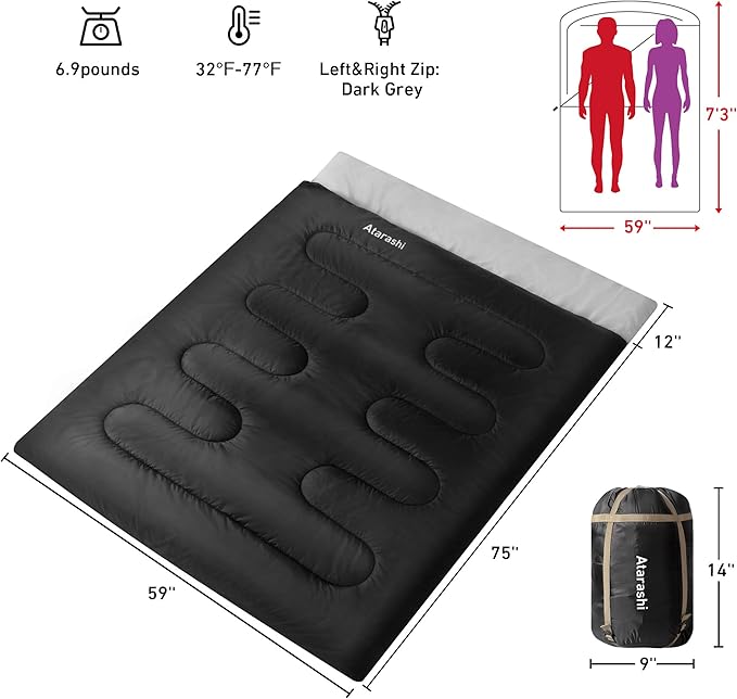 - SIZE & FILL - XXLarge 2 Person sleeping bag measures 59" by 87", fits most adults or kids up to 5'11" tall; The sleep bag with 12oz/yd² polyester insulation. The filling material is 400GSM, temperature rating 32-77°F(0-25°C), warm and comfortable, fits for 3-4 seasons camping & outdoors; Weight:6.9 lb