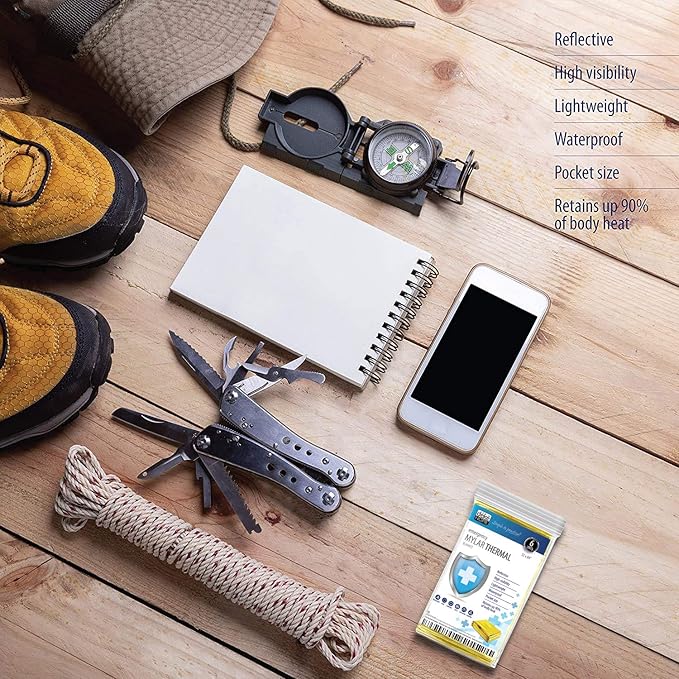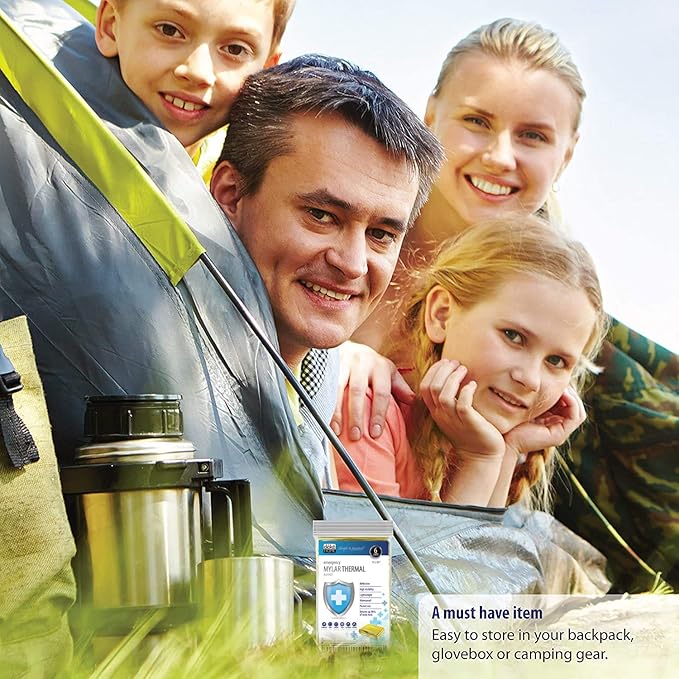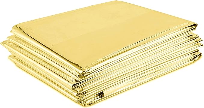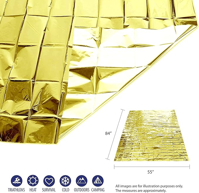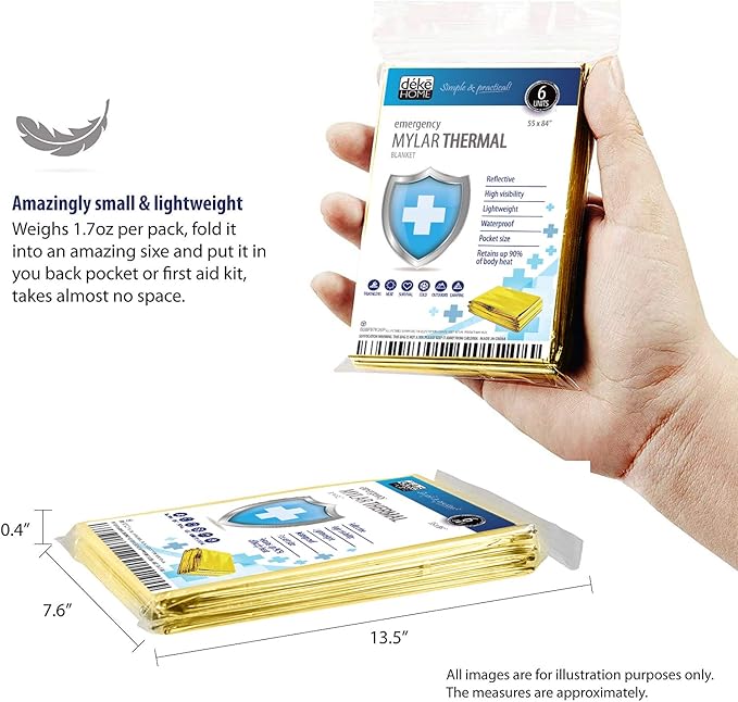 - 84x55” Mylar Survival Blankets (6 Pack) : Each survival blanket is individually folded, wrapped, and sealed for easy storage and retrieval. They are reusable, waterproof and windproof and can also be used for both ground cover and shade. Durable and advanced aluminized dual-sided Mylar blankets are perfect for conserving body heat in emergency survival situations.