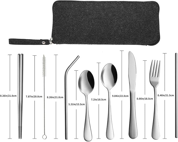 - ⭐ [ 9 PIECES TRAVEL UTENSILS INCLUDE ] : 1 X Chopsticks, 1 X Dinner Knife, 1 X Dinner Fork, 1 X Dinner Spoon, 1 X Dessert Spoon, 1 X Straight Straw, 1 X Bent Straw, 1 X Straw Cleaning Brush, 1 X Carrying Case. Free experience 4 pieces of food-grade silicone straw cases.