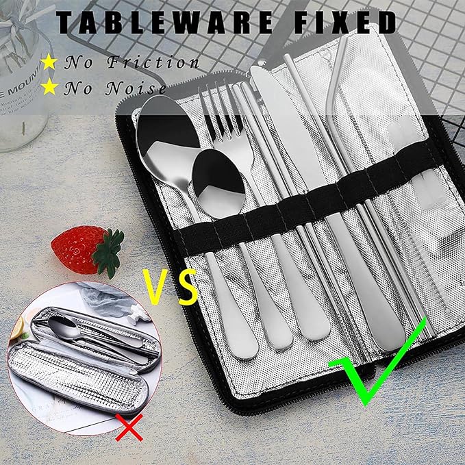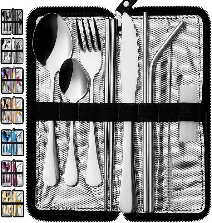 - ⭐ [ HEALTH AND ENVIRONMENT FRIENDLY ] : Protect the environment and refuse disposable utensils! Travel utensils set is made of high-quality food grade stainless steel. Our eco friendly portable cutlery set is durable and reusable for daily use. Easy to clean and dishwasher safe.