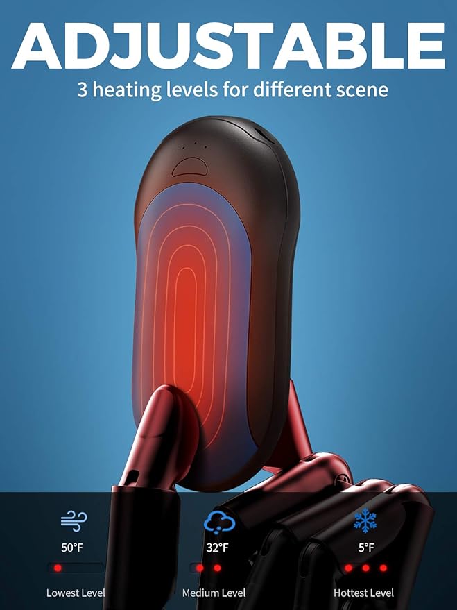 - Intelligent Heating Equipment: H01 have handy temperature controls button and 3 temperature levels to keep your hands warm in winters. High heating levels works for 8 hours, medium for 12 hours, low for 15 hours. Don't let the thought of cold fingertips keep you from your favorite outdoor activity this winter season.
