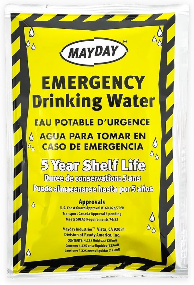 Mayday Pouch Water, Coast Guard Emergency Water, 5-Year Shelf LIfe, Disaster Preparedness Supplies for, Earthquake, Fire, Flood, Leak-Proof Pouches, 4.225 Oz/125Ml 50 Pack