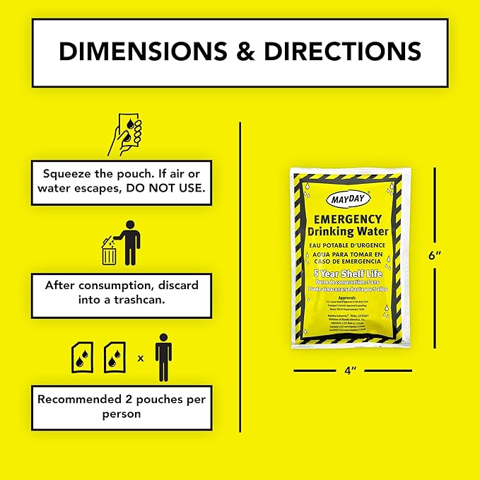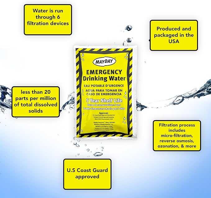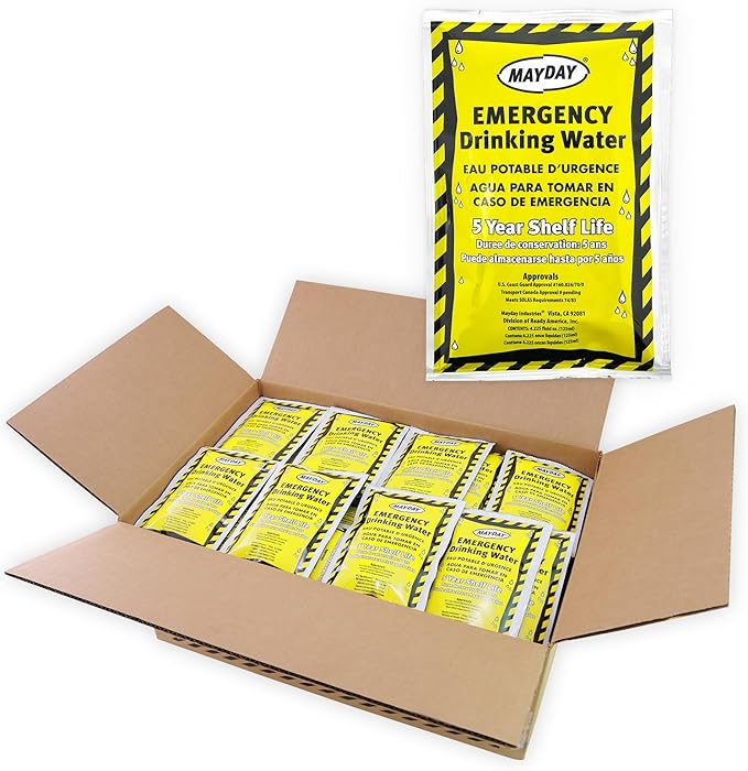 - EMERGENCY DRINKING WATER POUCHES: Mayday ready to drink water has a 5 year shelf life. Prevent hydration with Mayday water pouches. This bulk emergency drinking water pack includes 50 cartons. Lightweight cartons help make carrying easier rather than bottled water.