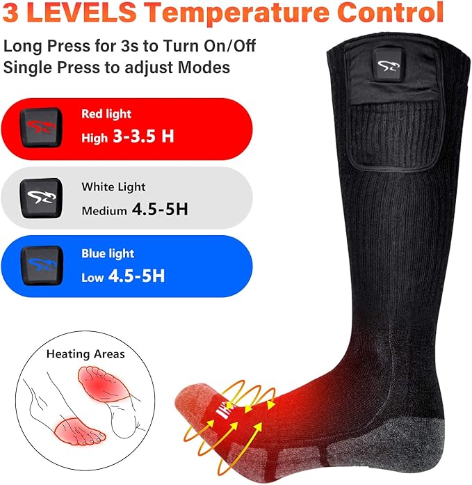 - 【3 Heating Levels - Easy to Use】The heated socks are easy to operate, even for elders- Red light is High level, temperature is 140-150℉, White light is Medium , temperature is 112- 131℉, red light is Low, temperature is 100-113℉. We suggest starting in high level for 15 mins, then turn to medium or low, you will feel all day warm! Perfect heated socks for winter camping, hunting, ice fishing, cycling, motorcycle, skiing, snowboarding etc.