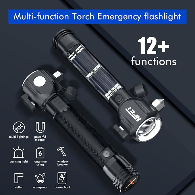 NPET T10-5 Solar Flashlight Car Flashlight Zoomable 1000 Lumens LED COB Light USB Rechargeable Tactical Multi-Function Torch Emergency Tool with Window Breaker Seat Belt Cutter Compass Siren