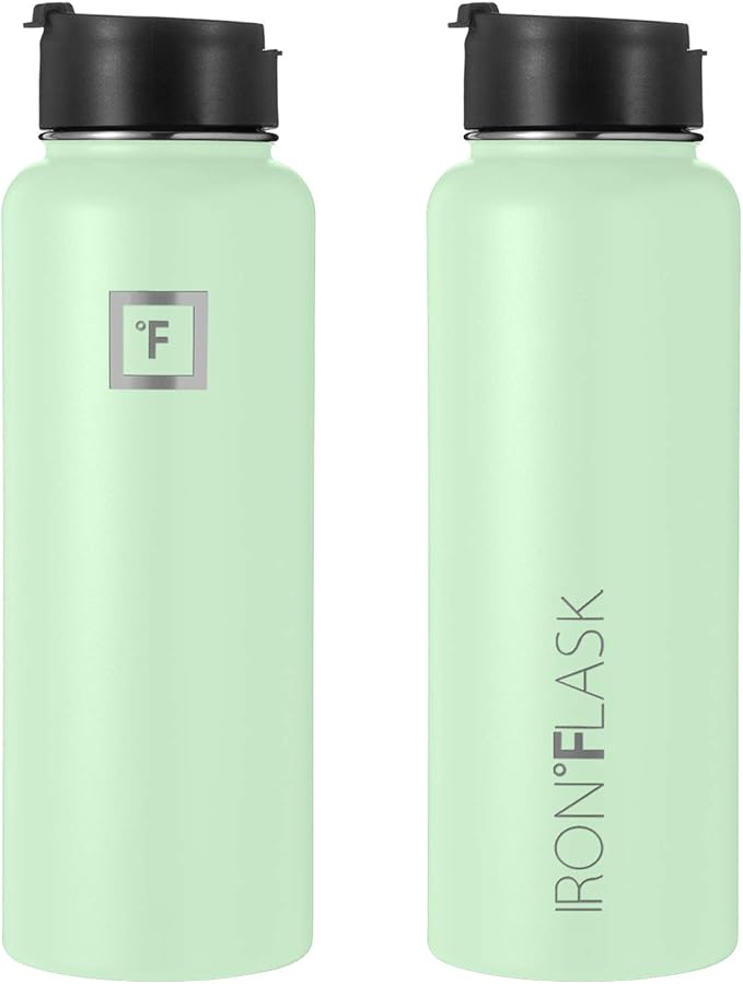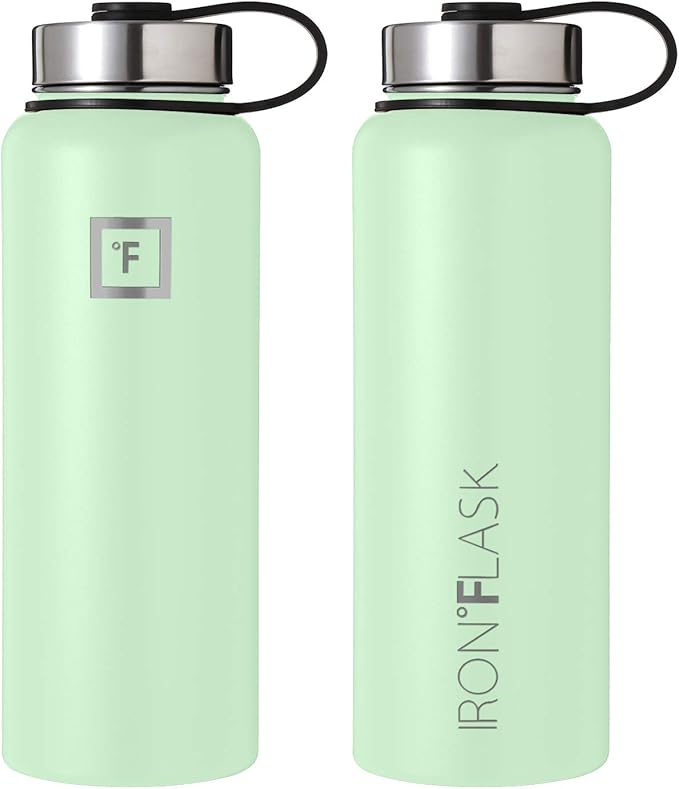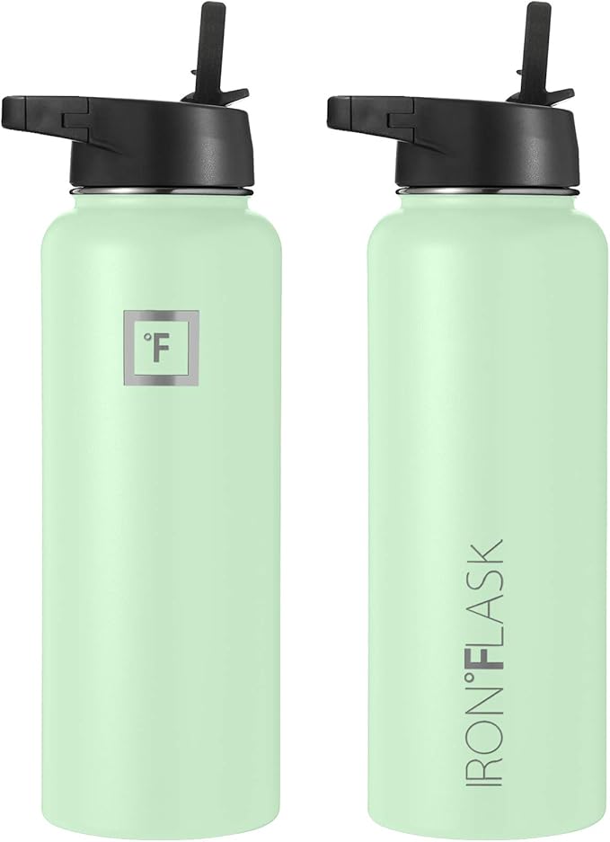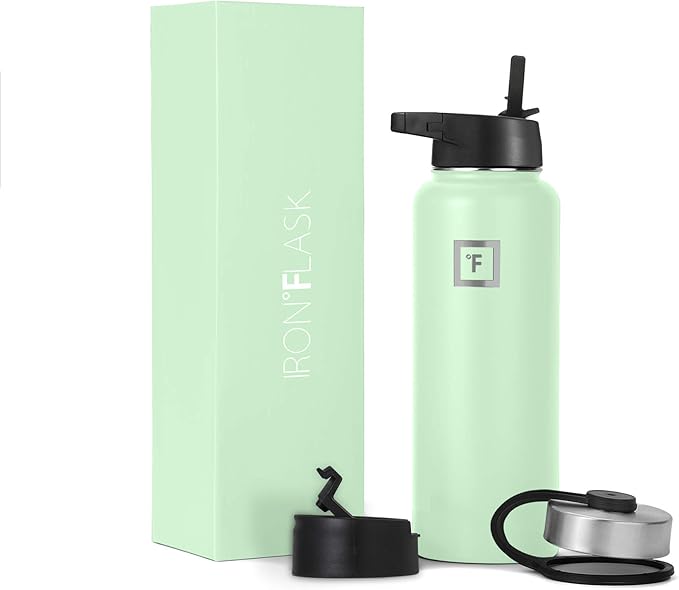 IRON °FLASK Camping & Hiking Hydration Flask, Wide Mouth, 3 Straw Lids, Stainless Steel Outdoor Water Bottle, Double Walled, Insulated Thermos, Metal Canteen - Mint, 40 Oz