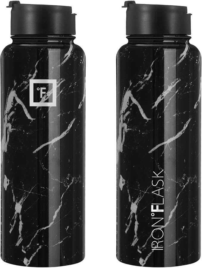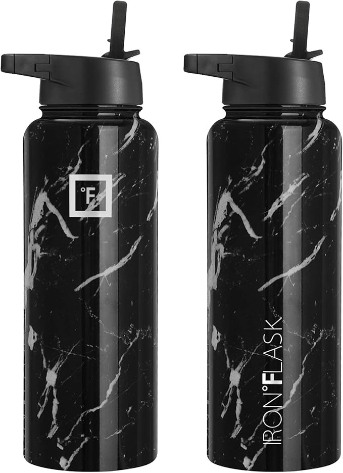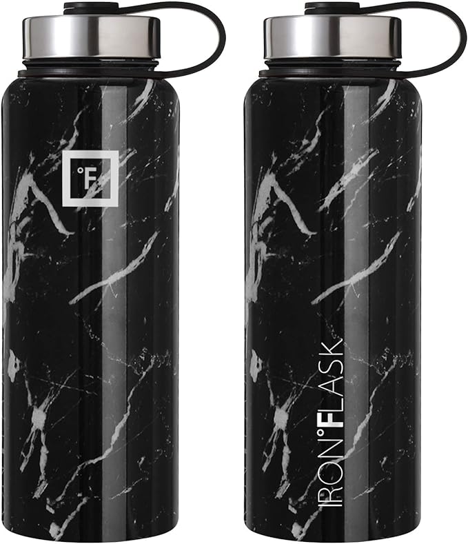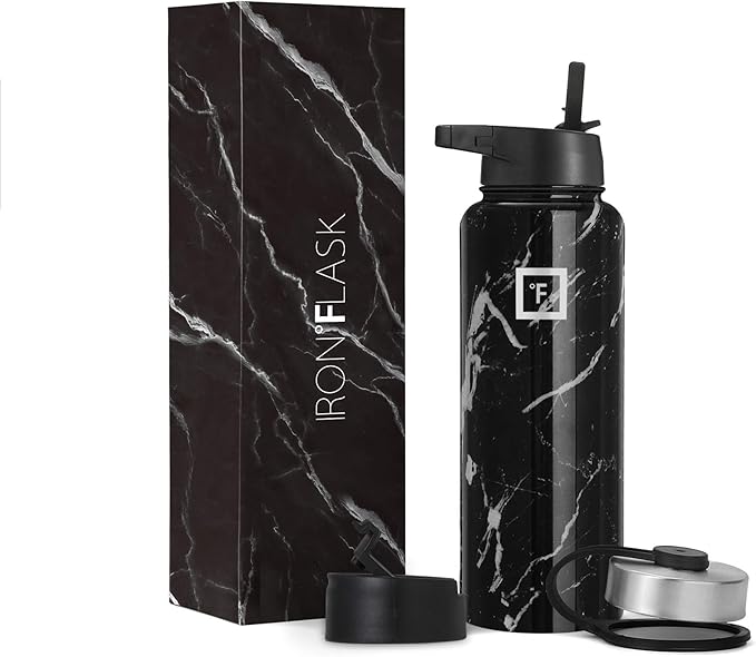 IRON °FLASK Camping & Hiking Hydration Flask, Wide Mouth, 3 Straw Lids, Stainless Steel Outdoor Water Bottle, Double Walled, Insulated Thermos, Metal Canteen - Black Marquina, 40 Oz