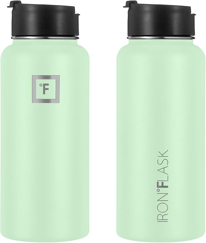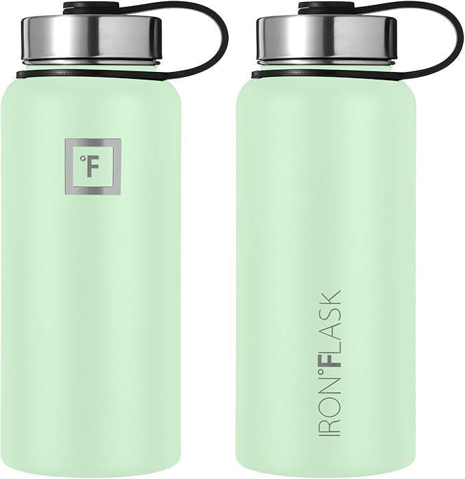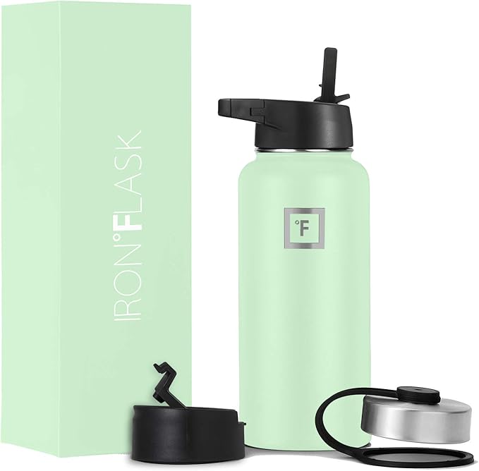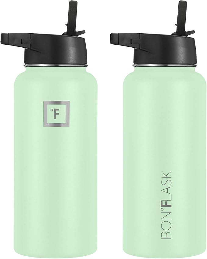 IRON °FLASK Camping & Hiking Hydration Flask, Wide Mouth, 3 Straw Lids, Stainless Steel Outdoor Water Bottle, Double Walled, Insulated Thermos, Metal Canteen - Mint, 32 Oz
