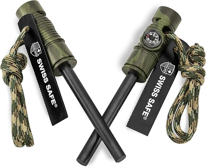 Swiss Safe 5-in-1 Fire Starter with Compass, Paracord and Whistle (2-Pack) for Emergency Survival Kits, Camping, Hiking, All-Weather Magnesium Ferro Rod