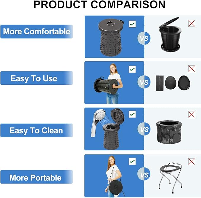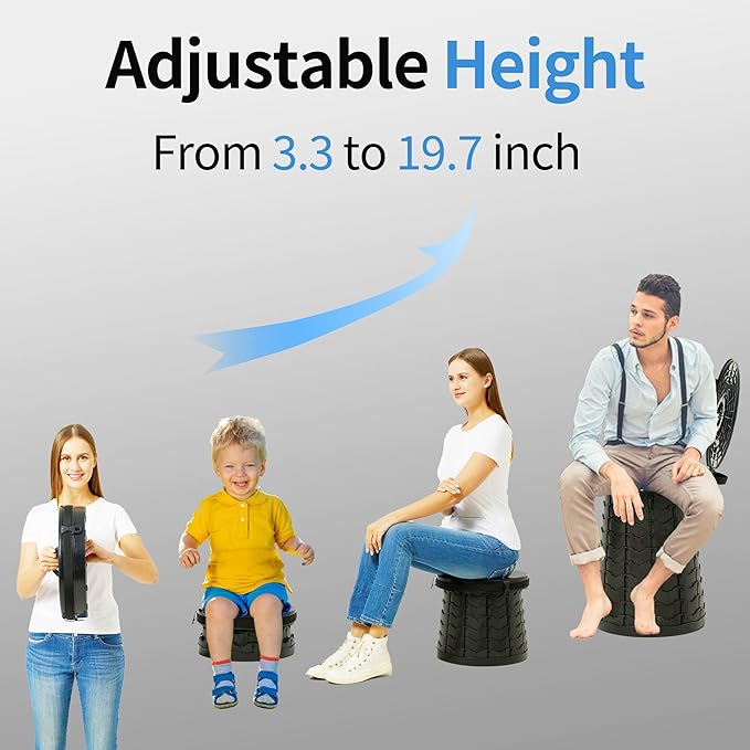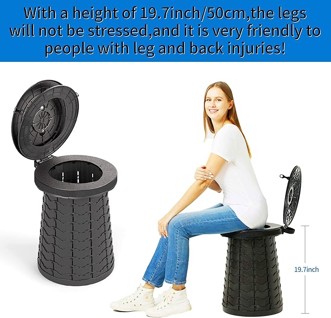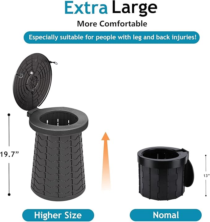 - 【New Upgraded Camping Toilet】The 2022 Upgraded Camping Toilet is wider and taller than a regular portable toilet. It can be adjusted to a comfortable height from 3.2 inches to 19.7 inches. It is suitable for adults and children and can hold up to 660 pounds, making it the best choice for outdoor trips.