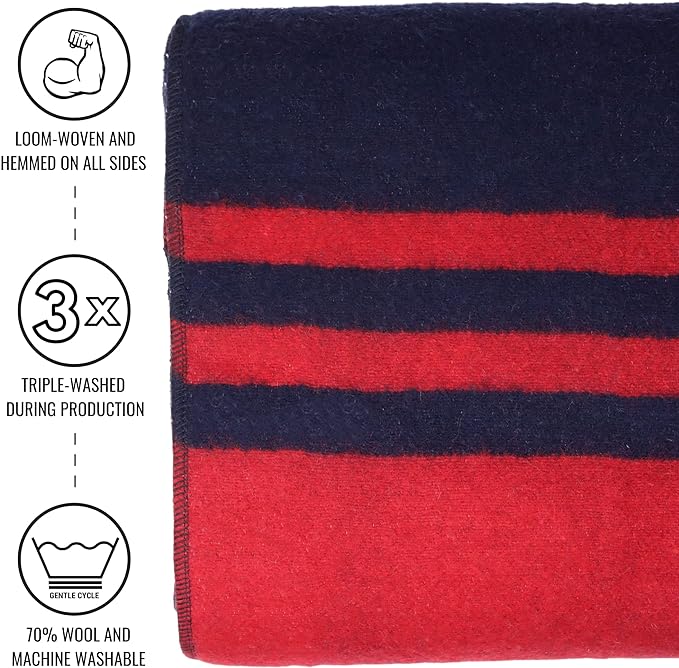 - 70% WOOL - Wool is a time-tested natural fabric that will keep you warm, even when wet. The remainder of the blanket is composed of 30% hypoallergenic synthetic fibers for durability and washability. Wool is a naturally fire-retardant material. The blanket itself is not treated with any additional flame-retardant chemicals, making it safe for you and your family.