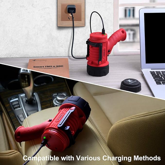 - A revolution about charging: Our spotlight flashlight abandon the original charging mode, Using the latest generation of USB-C charging technology, the charging time is shortened from 10 hours to 4 hours. Compatible with various charging methods, you can charge this high power flashlights at home or in your car (charging adapter is not included).