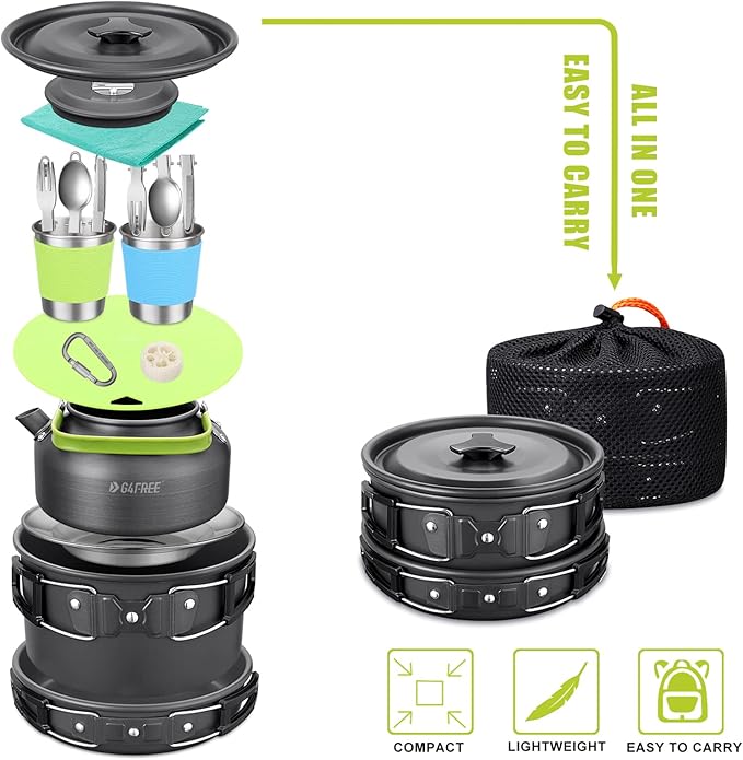 G4Free 19PCS Camping Cookware Mess Kit Non-Stick Pot and Pan Set with Kettle Stainless Steel Cups Plates Forks Knives Spoons Lightweight for Hiking Backpacking Cooking Picnic